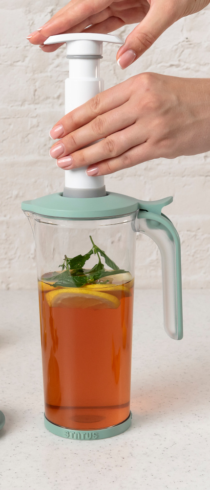 Obsługa zestawu próżniowego jest bardzo prosta. Wystarczy przyłożyć szczelnie pompkę tak, by zakryła cały zawór dzbanka lub jednej z pokrywek. Powietrze wypompowujesz ruchem pionowym do momentu wyraźnego oporu. Żeby otworzyć dzbanek lub pokrywkę przesuń delikatnie zawór i wpuść powietrze do środka.
